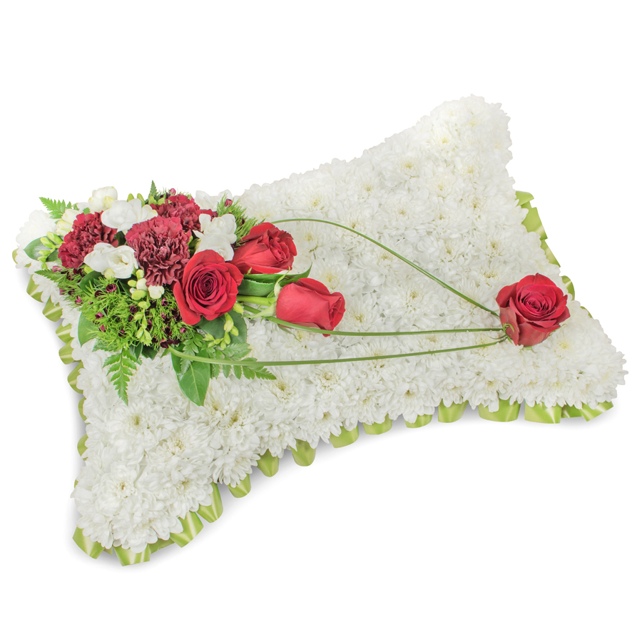 Experience a refined expression of sympathy with our gorgeous floral creation. This meticulously arranged bouquet blends white chrysanthemums, red roses, white freesias, dark red carnations, dianthus, and bear grass into a stunning display of natural beauty. Each flower is especially hand-selected to ensure it meets the highest standards of freshness and quality.